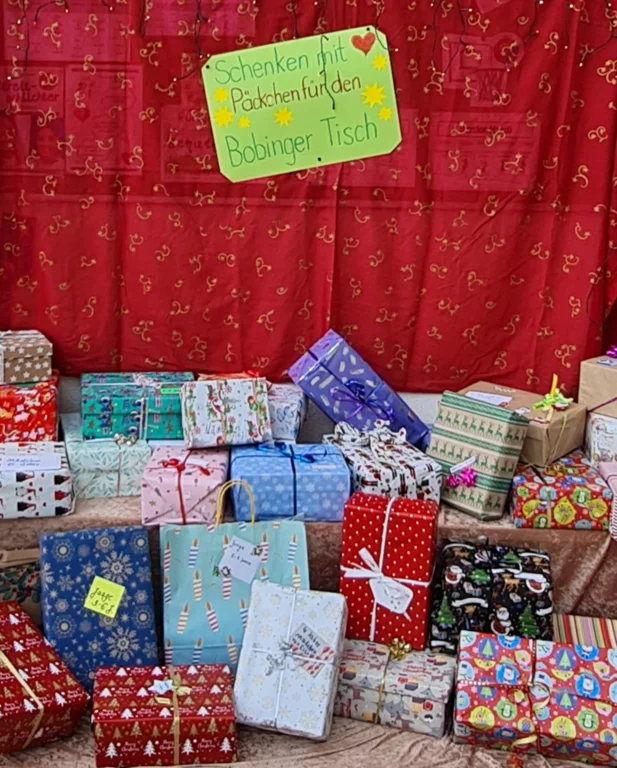 Eine große Menge an liebevoll verpackten Geschenkkartons sammelten sich in der Pausenhalle und warteten darauf, an den Bobinger Tisch übergeben zu werden. Pünktlich zur Weihnachtszeit wurden die Geschenke dann am 11. Dezember von den Mitarbeiterinnen des Bobinger Tisches abgeholt, um sie anschließend an die vielen Kinder und ihre Familien weitergeben zu können.
