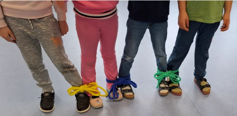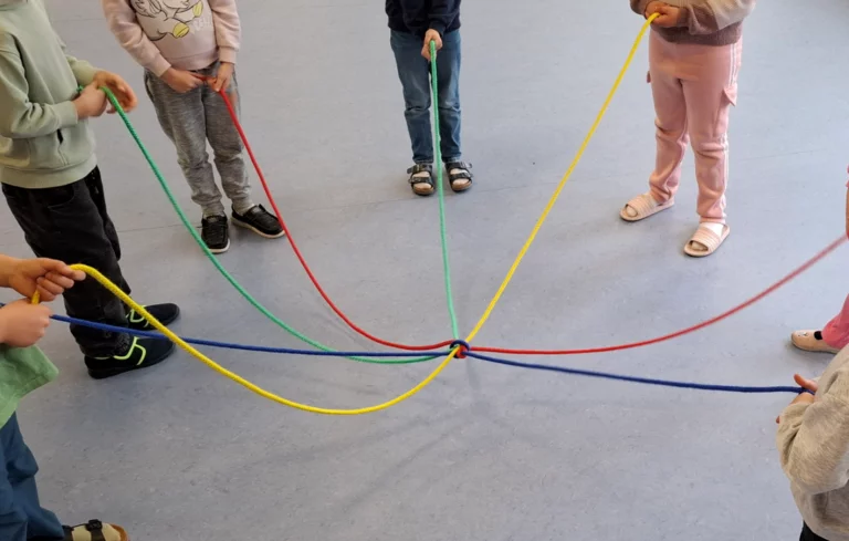 Geübt wird kindgerecht durch verschiedene (Kooperations-) Spiele und Übungen bei denen verschiedene Herausforderungen gemeinsam gelöst werden müssen.