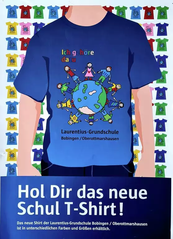 Für alle unsere Schülerinnen und Schüler verkaufen wir Schul-T-Shirts in den Farben gelb, grün, rot und blau - in den passenden Kindergrößen - für 12 Euro. Diese erhalten Sie an den Vormittagen im Sekretariat.